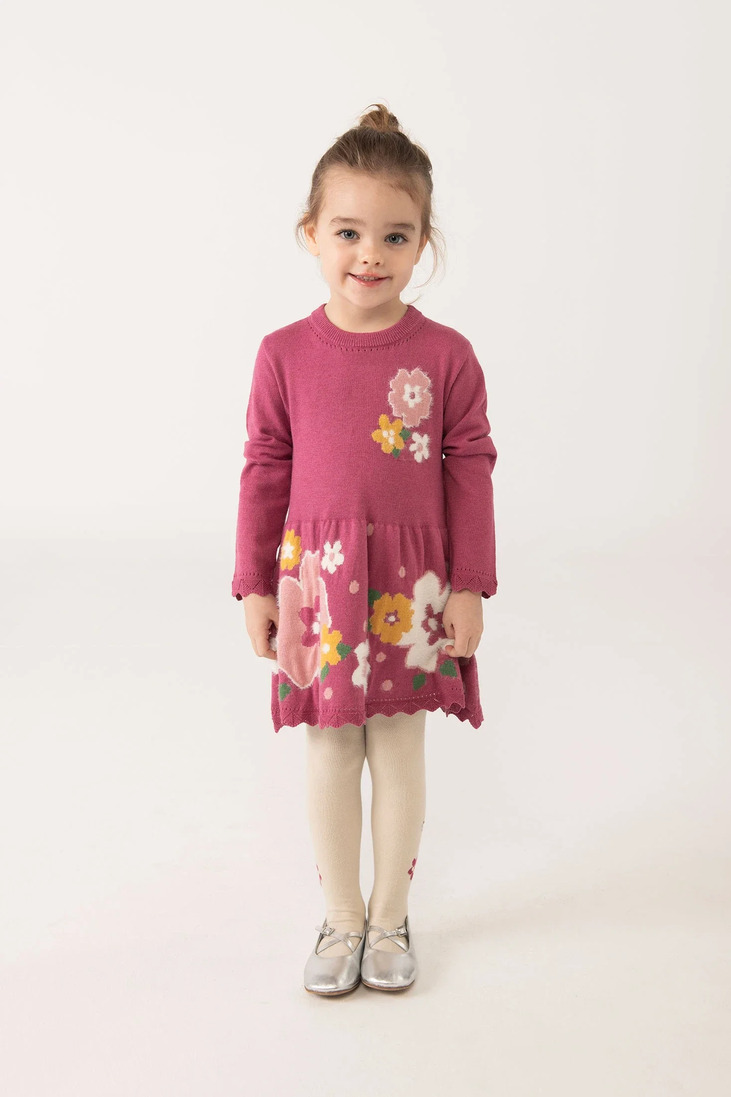 Abito color fragola, perfetto per la stagione autunnale e invernale, offre comfort e calore grazie al suo tessuto morbido. Presenta un design floreale in tonalità rosa, giallo e bianco su uno sfondo fragola, che dona un tocco allegro di colore al guardaroba. Con scollo rotondo e maniche lunghe, è ideale per i giorni più freschi. Disponibile in taglie da 12 mesi a 10 anni, si abbina perfettamente con collant e giacche, creando un look elegante e confortevole per le piccole.