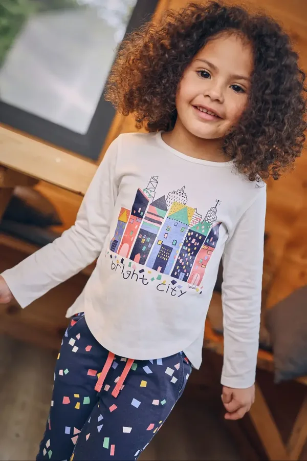 Maglietta in maglia bianca per bambina con un disegno di edifici in tonalità vibranti, perfetta per le stagioni autunno e inverno. Realizzata in un tessuto a maglia che garantisce comfort e libertà di movimento. Presenta un collo rotondo e maniche lunghe per offrire calore nei giorni più freschi. Disponibile in taglie che vanno dai 12 mesi ai 10 anni. Ideale da abbinare con jeans o gonne, aggiunge un tocco urbano e colorato al guardaroba della tua bambina.