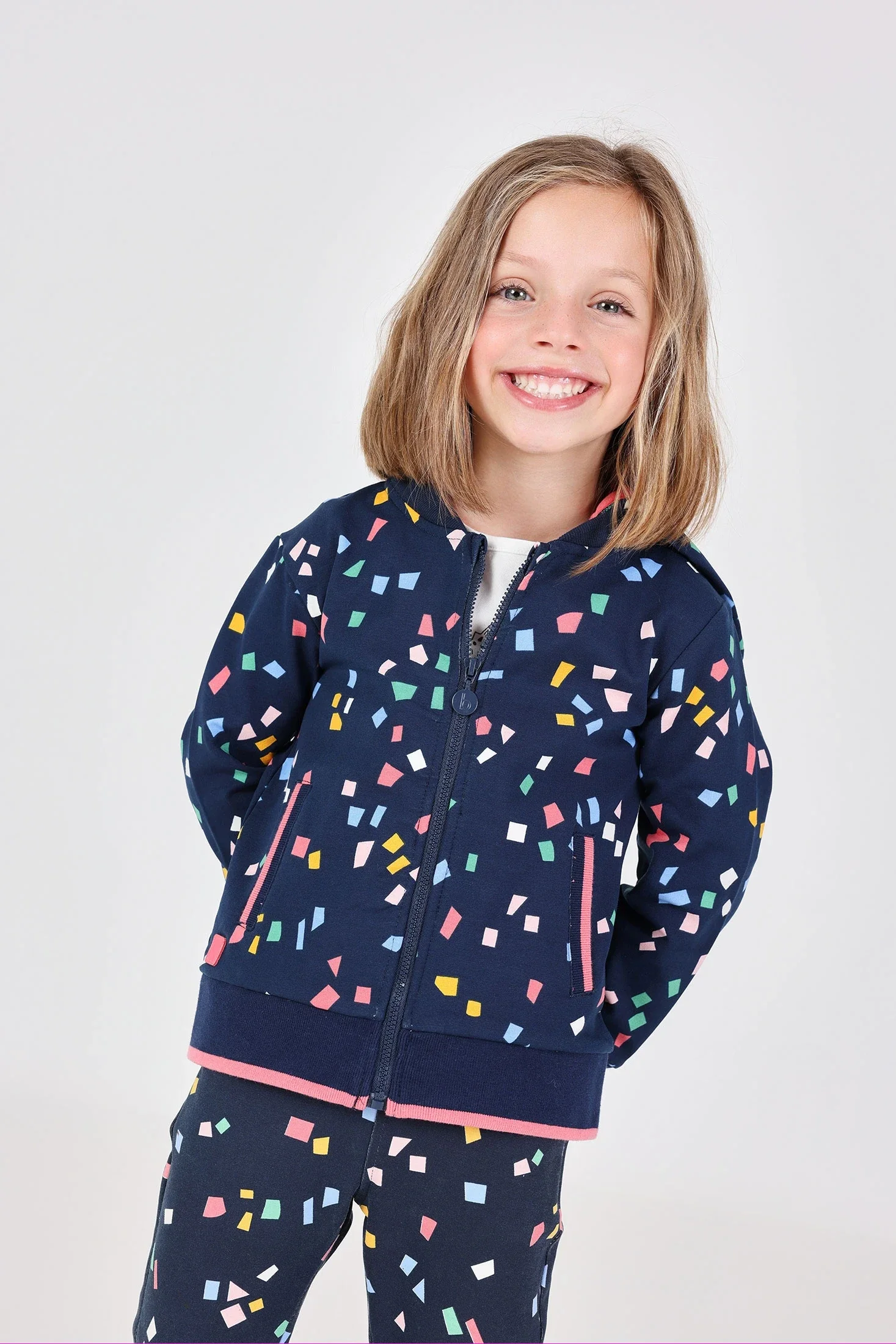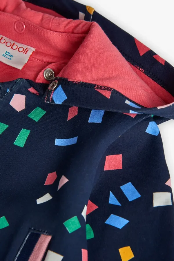 Giacca in pile per bambina nel colore blu marino con design geometrico, perfetta per mantenere la piccola comoda e calda durante le stagioni autunnali e invernali. Realizzata con un tessuto morbido e caldo, garantisce il benessere del bambino durante l'uso. Disponibile in taglie da 12 mesi a 10 anni, offre versatilità e stile, abbinandosi perfettamente a pantaloni o gonne. Ideale per creare un look incantevole e funzionale per ogni occasione.