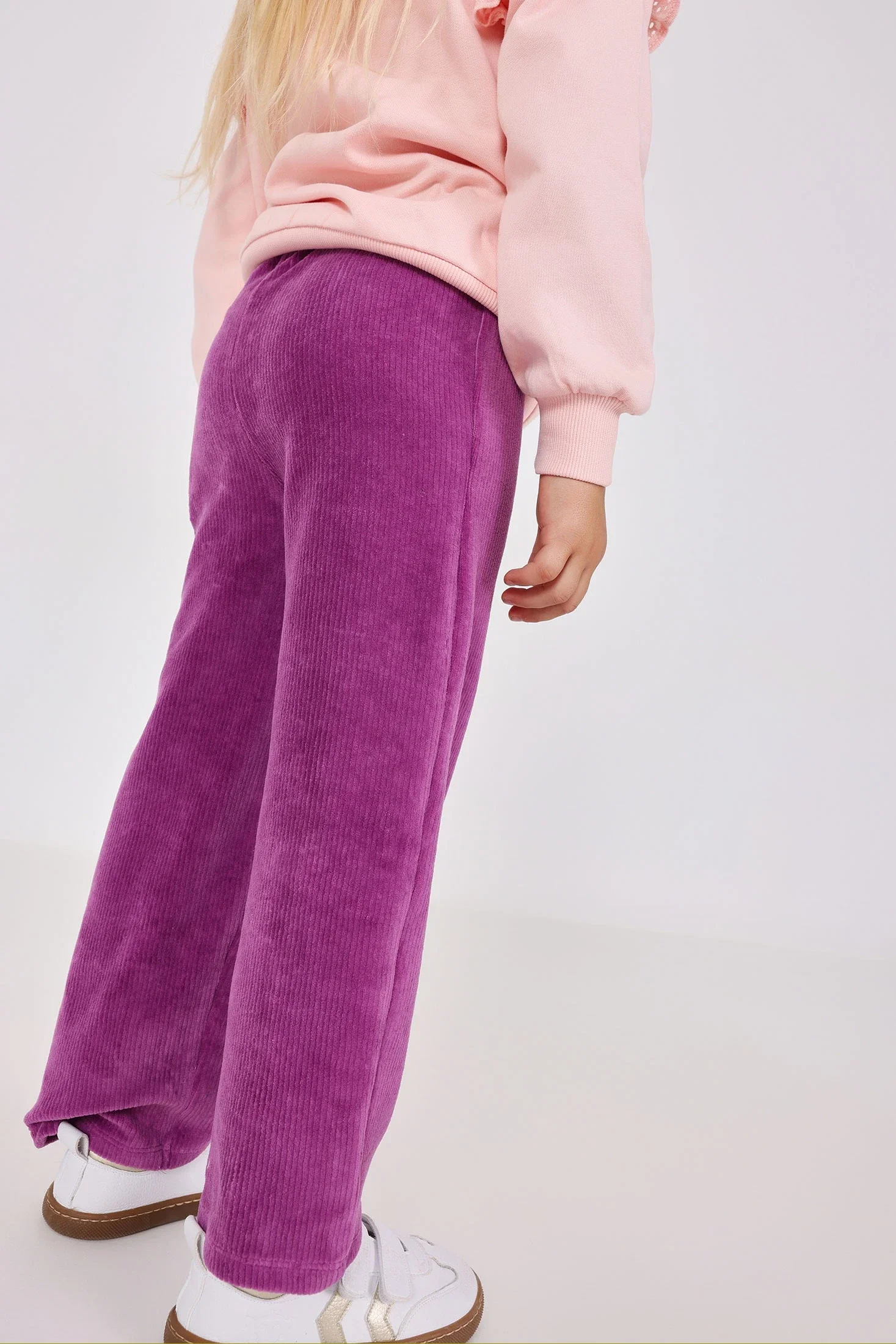 Pantaloni a coste a maglia per bambina di colore viola, scelta ideale per le stagioni autunnali e invernali, offrendo comfort e calore. Realizzati in morbido tessuto a maglia, garantiscono comodità per tutto il giorno. Il loro design elegante e versatile permette di abbinarli facilmente ad altri capi per look sia casual che più formali. Questi pantaloni diventano un capo essenziale per completare il guardaroba di ogni piccolo.