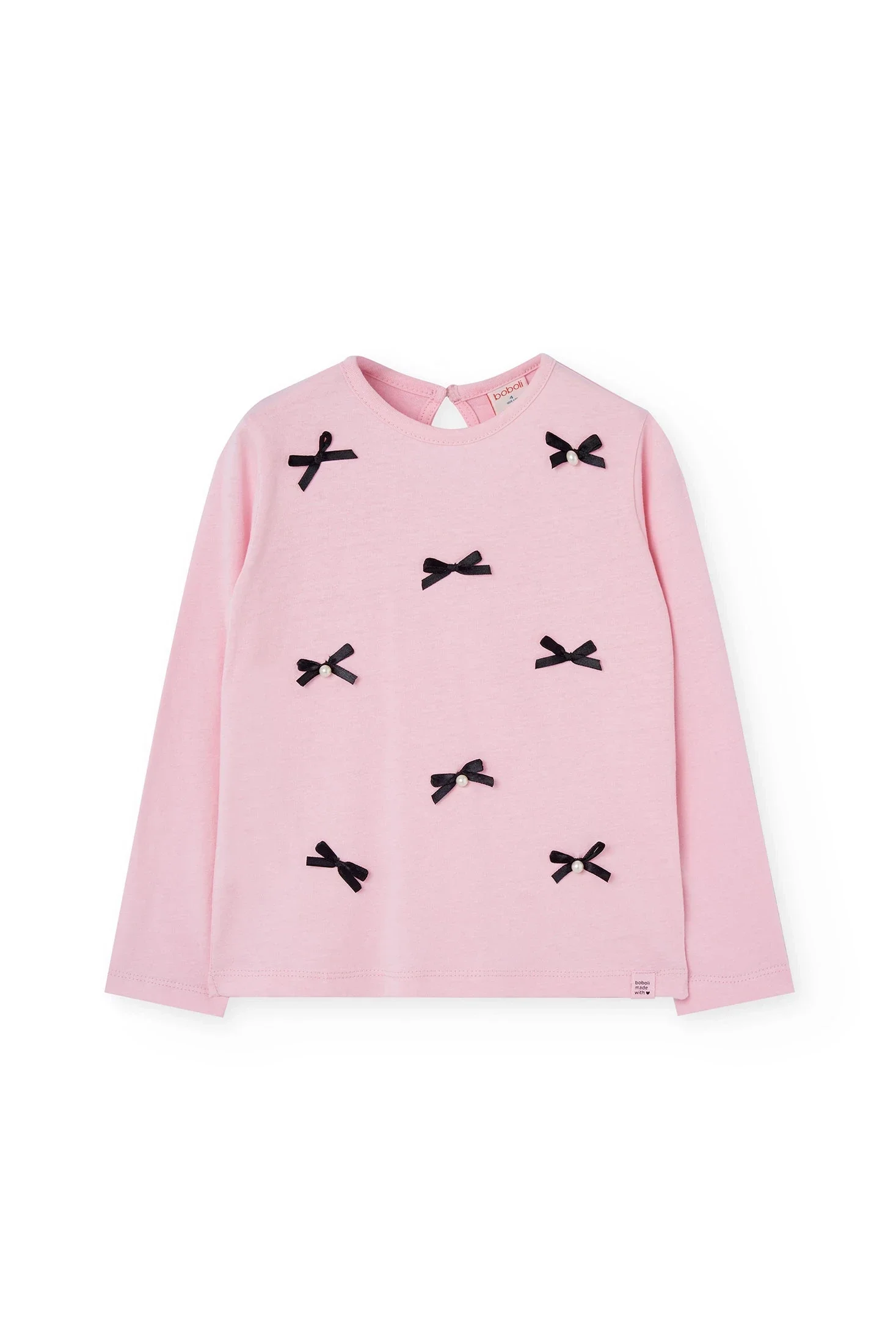 Maglietta rosa a maglia con fiocchi, un'opzione incantevole per bambine, ideale per le stagioni autunnali e invernali. Decorata con delicati fiocchi neri, aggiunge un tocco elegante e femminile all'abbigliamento. Realizzata con materiali morbidi e confortevoli, è perfetta per l'uso quotidiano mentre offre calore con le sue maniche lunghe e il collo rotondo. Si abbina facilmente a gonne, pantaloni o leggings, diventando un capo base versatile e grazioso per qualsiasi guardaroba infantile.
