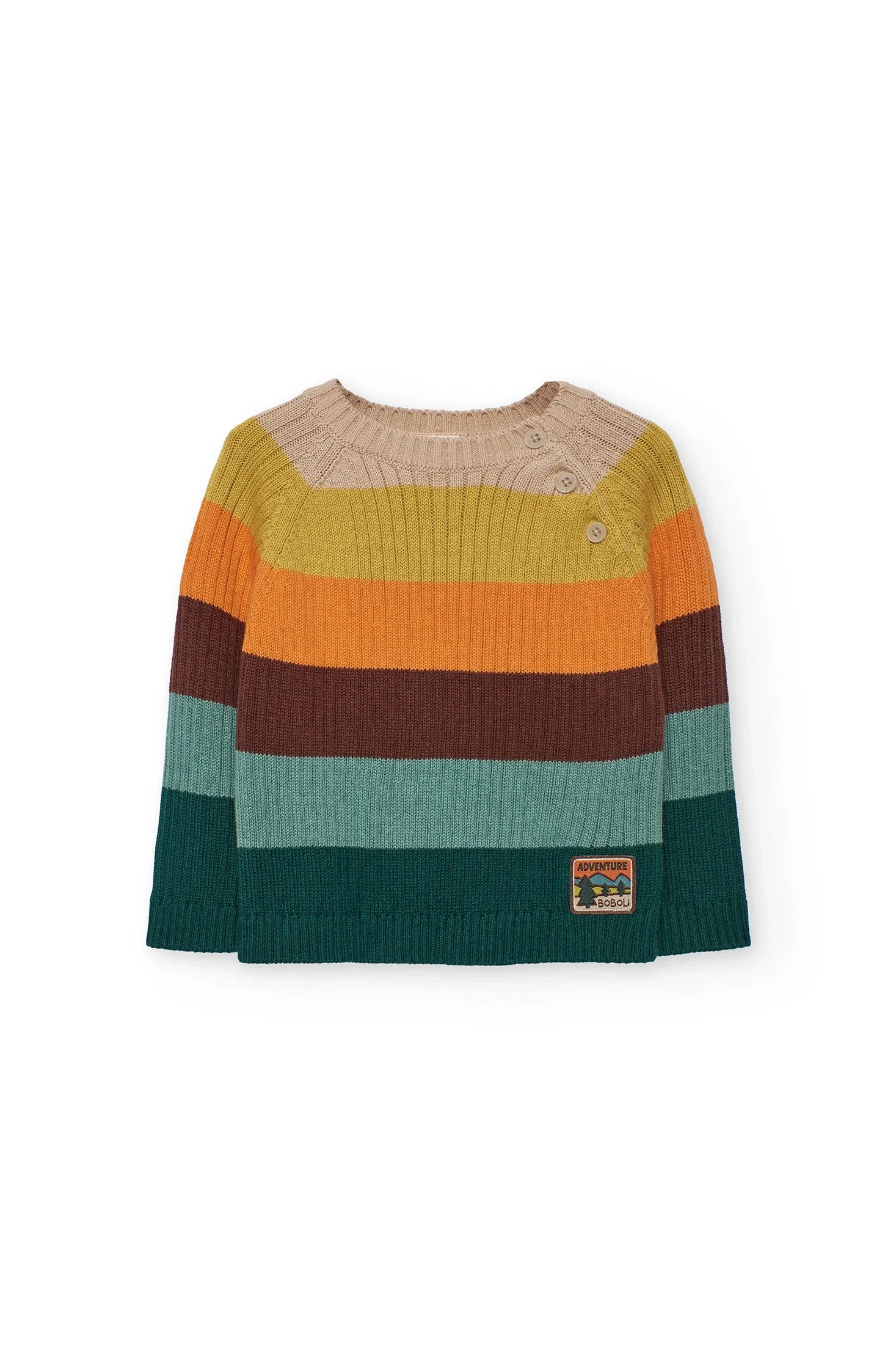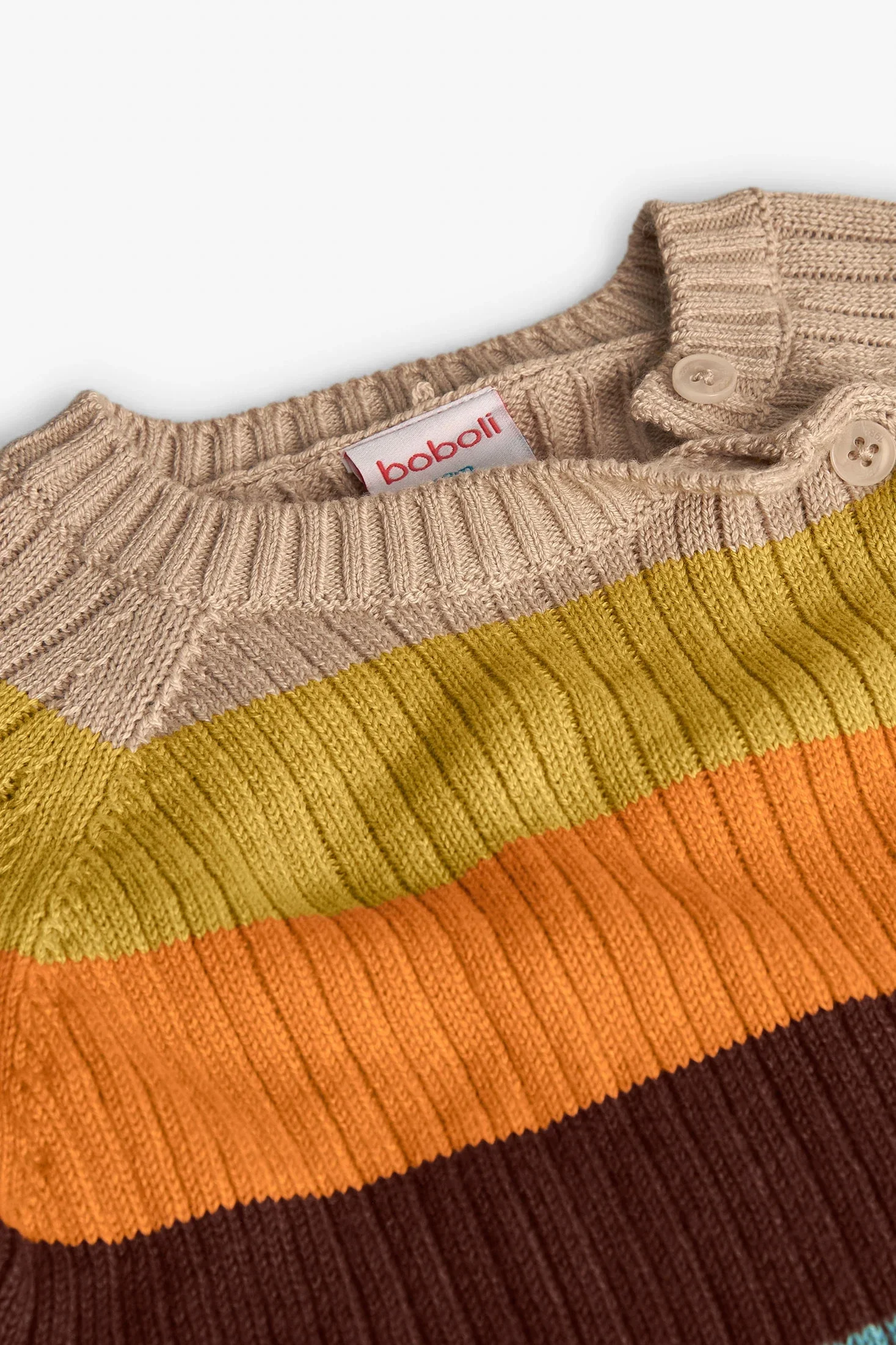 Maglione in maglia per bambino con righe in tonalità beige, ideale per le stagioni autunnali e invernali. Realizzato in tessuto tricot, offre calore e comfort, mantenendo i piccoli al caldo durante i giorni freddi. Design con scollo rotondo e pratici bottoni sulla spalla per facilitare la vestizione. Il maglione si abbina perfettamente con jeans o pantaloni scuri per ottenere un look classico ed elegante.