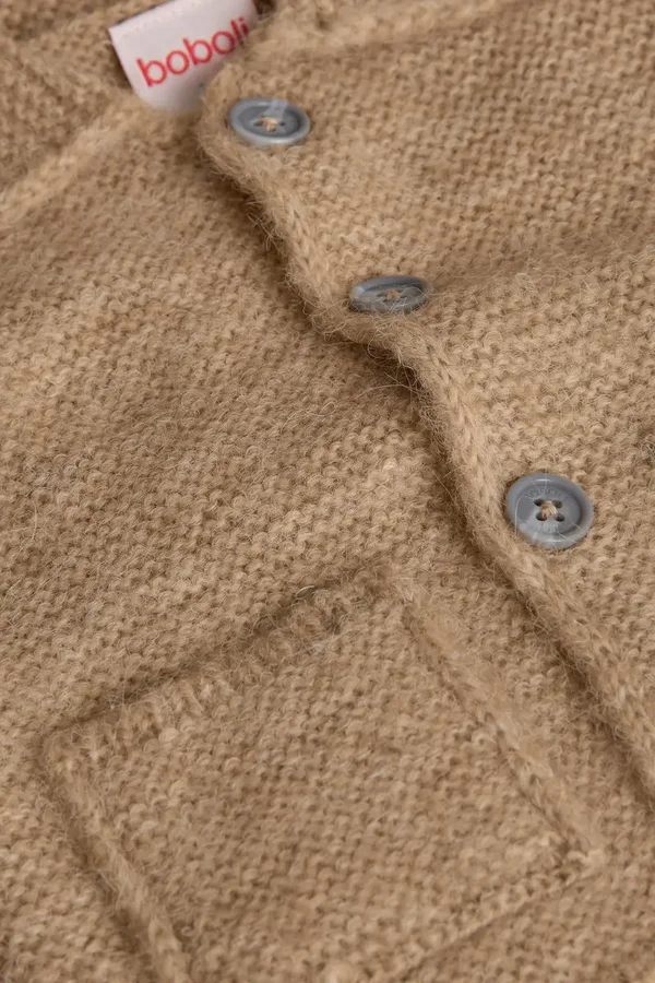 Cardigan beige per bebè, progettato per offrire comfort e calore nei mesi autunnali e invernali. Realizzato in un tessuto a maglia morbido e delicato, è ideale per proteggere il tuo piccolo dal freddo. Il design classico e sobrio in beige conferisce un tocco di raffinatezza, facilmente abbinabile a pantaloni o completi formali per occasioni speciali. Questo cardigan diventa un capo versatile per il guardaroba del tuo bebè.
