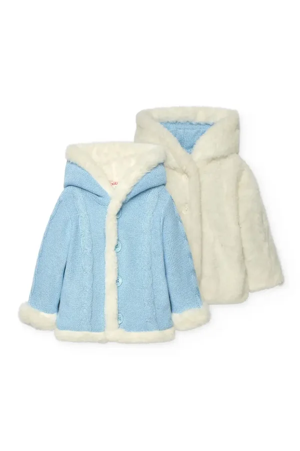Giacca reversibile per bebè in blu, realizzata in maglia per offrire calore e morbidezza durante le stagioni fredde. Il design reversibile permette di alternare tra uno stile semplice e un altro con dettagli discreti, aumentando la sua versatilità. Include una chiusura frontale con bottoni per facilitare il cambio d'abbigliamento. Ideale da abbinare con pantaloni o salopette. Un'opzione funzionale e stilosa per mantenere il tuo piccolo comodo e al caldo.