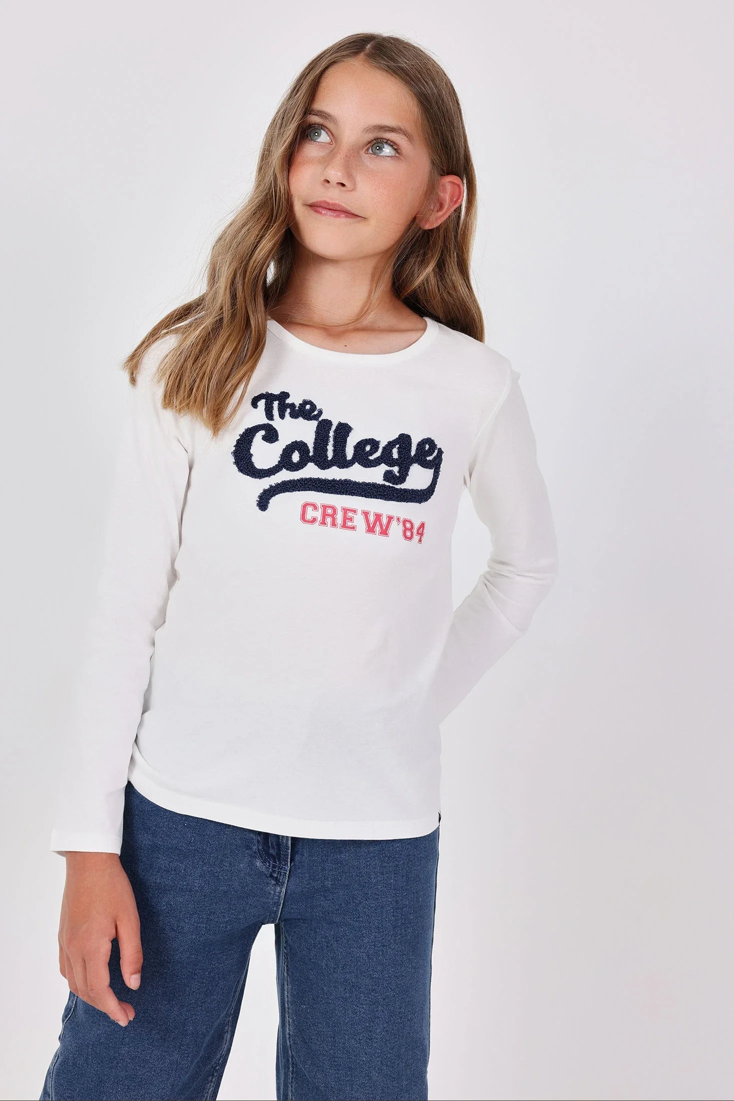 Maglietta a maniche lunghe per bambina realizzata in un comodo tessuto a maglia ideale per le stagioni autunnali e invernali. Presenta un design bianco con lettere in tonalità blu e rosse, aggiungendo un tocco moderno e divertente. Indumento versatile che si abbina perfettamente a diversi outfit, diventando una scelta elegante per tutti i giorni.